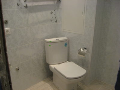 Наша компания выполнила комплексный ремонт санузла в хрущевке на улице Обручева. Для облицовки стен мы выбрали белую плитку с утонченным рисунком. В ходе проведения работ была уложена новая стяжка, смонтирован подвесной потолок и почищена система вентиляции. Вытяжное отверстие мы задекорировали решеткой. Коллектор водоснабжения разместили в боковом углу комнаты, закрыв ее распашной дверцей. В санузле установили рукомойник с тумбой, унитаз, электрический полотенцесушитель и ванну. Дополнительно смонтировали стеклянную полку и держатель для бумаги. Общая стоимость ремонта составила 98 тысяч рублей. Цена черновых материалов — 33000 р.