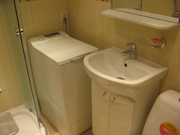 Наша компания выполнила ремонт санузла в квартире на улице Рудневка. Для облицовки стен мы выбрали однотонную керамическую плитку бежевого цвета, а для оформления потолка пластиковые панели. На пол уложен кафель с горизонтальным рисунком в тон общему интерьеру. Несмотря на малую площадь помещения, нам удалось компактно разместить в нем душевую кабину, стиральную машину вертикального типа, мойдодыр на две створки и унитаз. На боковых стенах установлен подвесной шкаф и вмонтированы крючки для полотенец. Для освещения в потолок встроены точечные светильники. Смета на ремонт — 113 тысяч рублей. На черновые материалы ушло 34 тыс. руб.