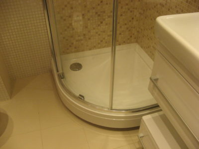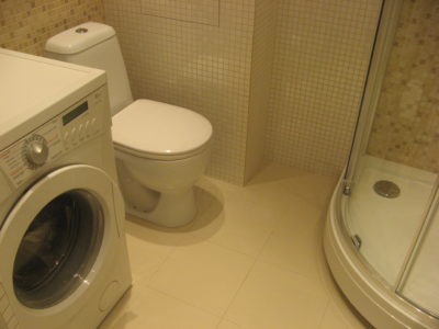 Наша компания выполнила капитальный ремонт совмещенного с ванной комнатой санузла на улице Новочеремушкинская. Для декорирования поверхностей дизайнер выбрала мозаичную плитку двух видов: однотонную и цветную. Благодаря правильно подобранному расположению сантехники малогабаритное помещение выглядит просторным, а за счет теплых оттенков плитки – уютным. В санузле мастера установили полукруглую душевую кабину со стеклянными дверцами и рукомойник с тумбой с правой стороны от входа, а компактный унитаз, полотенцесушитель и стиральную машину – с левой. В подвесной потолок вмонтированы точечные светильники, а на пол уложен кафель светло-бежевого цвета. Цена ремонта – 126 тысячи рублей. Стоимость черновых материалов – 32 тыс. руб