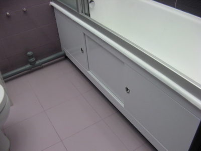 В санузле установлены ванна с защитными стеклянными шторками и гибким душем, унитаз, полотенцесушитель и стиральная машина. Потолок оформлен металлическим профилем с прозрачными панелями. Смета по ремонту составила 121 тысячу рублей. Стоимость черновых материалов — 30 тыс. 200 руб.