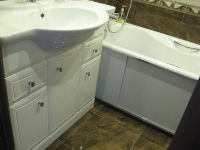 Наша компания выполнила ремонт ванной и туалета на Свободном проспекте. Дизайн выполнен в контрастных цветах с применением белого, коричневого и золотого оттенков.