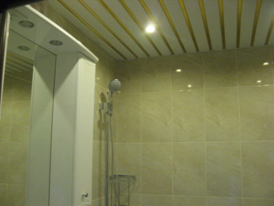 В ванной комнате удалось компактно расположить ванну с боковыми ручками и гибким душем, мойдодыр на три секции и навесные полки. Точечные светильники вмонтированы в подвесной потолок из пластиковых панелей. В туалете установлен новый унитаз, стены облицованы двухцветным кафелем, а на пол уложена керамическая плита с имитацией под мрамор.