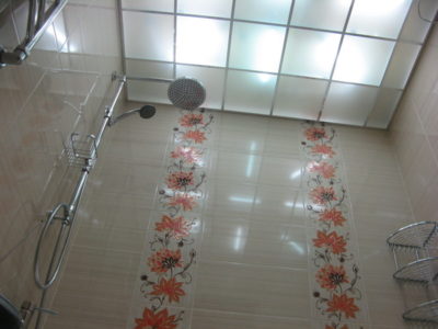 Наша компания выполнила ремонт ванной комнаты и туалета на улице Гарибальди. Для облицовки стен и оформления пола мы выбрали кафель кремового цвета. Разбавить скучный интерьер удалось за счет отделки боковых поверхностей и экрана под ванной декоративным узором из керамической плитки с роскошным цветочным рисунком. В ванной комнате установлены полотенцесушитель, мойдодыр и ванна с гибким душем. На потолке смонтирована подвесная конструкция из металлического профиля и стеклянных панелей. В туалете установлен новый унитаз, а инженерные коммуникации замаскированы под общий интерьер. Стоимость работ под ключ составила 112 тысяч рублей. Черновые материалы — 36 тыс. р.