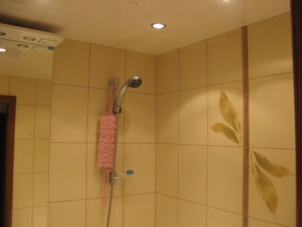 В ходе ремонта были полностью демонтированы устаревшее сантехническое оборудование и отделка с поверхностей. На стены и полы в помещениях уложена керамическая плитка оливкового цвета, а потолок выполнен из пластиковых панелей. Привнести в дизайн нотку элегантности удалось за счет укладки декоративных элементов с имитацией под бамбуковое дерево.
