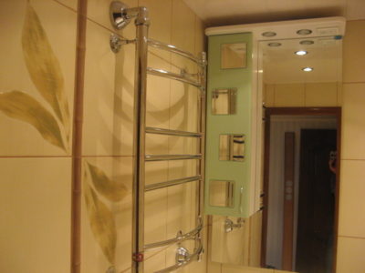 В ванной комнате были установлены полотенцесушитель, двухстворчатый мойдодыр, навесной шкаф с зеркалом, полотенцесушитель и ванна. В туалете сантехники смонтировали гребенку отопления, замаскировав ее за раздвижным экраном. Общая стоимость черновых материалов — 30400 руб.