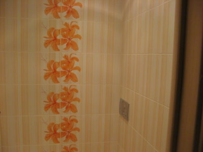 Наша компания выполнила косметический ремонт ванной комнаты на улице Флотская. В ходе демонтажных и ремонтно-отделочных работ была полностью заменена отделка стен, пола и потолка. Для обустройства потолочной конструкции использовались пластиковые панели, а для облицовки боковых поверхностей мы выбрали керамическую плитку бело-оранжевого цвета. На пол уложены оранжевые плиты. Для придания интерьеру эксклюзивности на стене выложен вертикальный цветочный узор. В углу установлен душевой поддон, а на потолке смонтирована система точечного освещения. Общий бюджет ремонта составил 43 тысяч рублей. Стоимость черновых материалов — 15 тыс. руб.