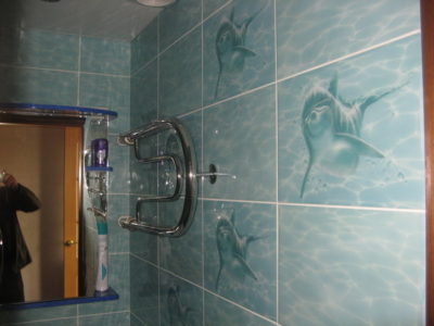 Наша компания выполнила ремонт ванной комнаты на бульваре Любы Новоселовой. Отличительная особенность дизайна — оформление отделки со стилизацией морского дна. Впечатление усиливают фактурный рисунок погибшего корабля, а также изображения дельфинов по всему периметру помещения. На пол уложена керамическая плитка нежно-голубого цвета под общий интерьер. Таким же кафелем облицован защитный экран под ванной. Кроме основного сантехоборудования смонтирован подвесной умывальник, под которым установлена стиральная машина. На стену навешано зеркало, установлены полотенцесушитель, подставка для гибкого душа и перекладина для штор. Потолок оформлен пластиковыми панелями со встроенными светильниками.